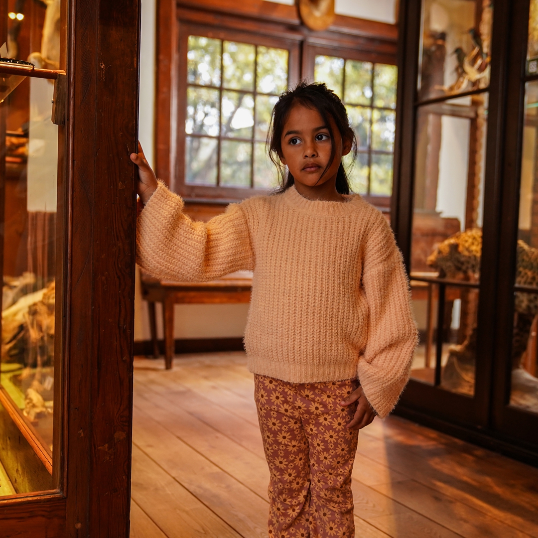 Pantalon fille à motif aux tons beige et orangé, style legging avec coupe patte d’éléphant. Confortable et tendance, il offre une silhouette ajustée sur les hanches et évasée sur le bas pour un look original et moderne. Parfait pour compléter les tenues du quotidien ou des occasions spéciales.
