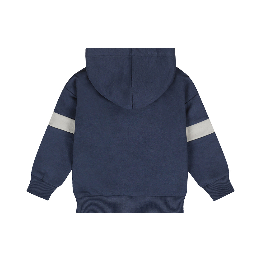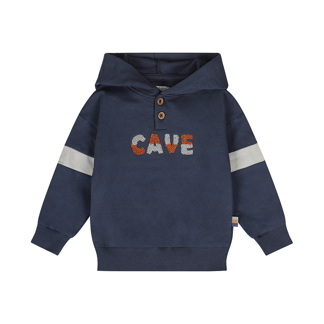 Sweat à capuche pour bébé garçon, bleu foncé, avec resserrement aux manches et à la taille pour un confort optimal. Chaque manche est ornée d’une bande blanche, et le devant affiche un logo coloré “CAVE” en blanc et orange pour un style moderne et tendance. Doux et pratique, idéal pour le quotidien et les sorties.